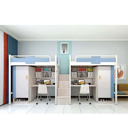 學生公寓床安全性高,且不說床的穩(wěn)固性,主要是床上兒童容易觸及的地方, 都采用圓角設(shè)計,避免了意外事故的發(fā)生;其次學生公寓床的梯子中間有凹痕,起到了防滑作用。
